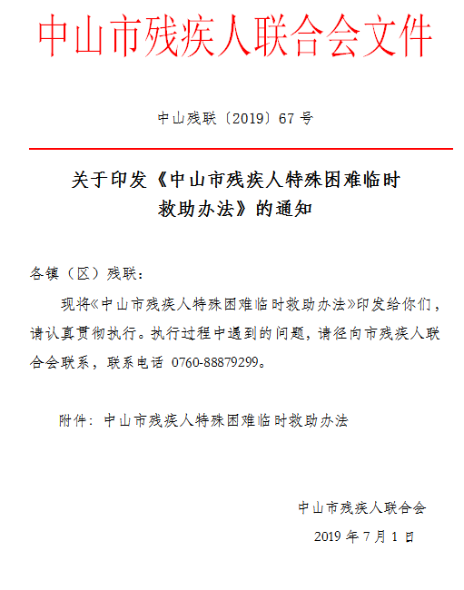 第一条 为进一步完善残疾人社会保障体系,切实解决残疾人临时性特殊困难,根据《中山市残疾人保障办法》(中府〔2017〕48号)有关规定,制订本办法。